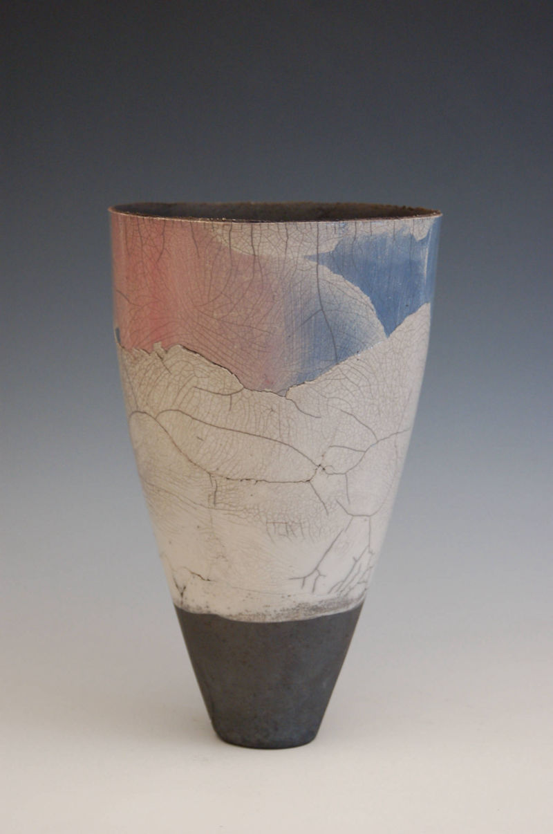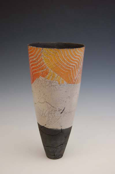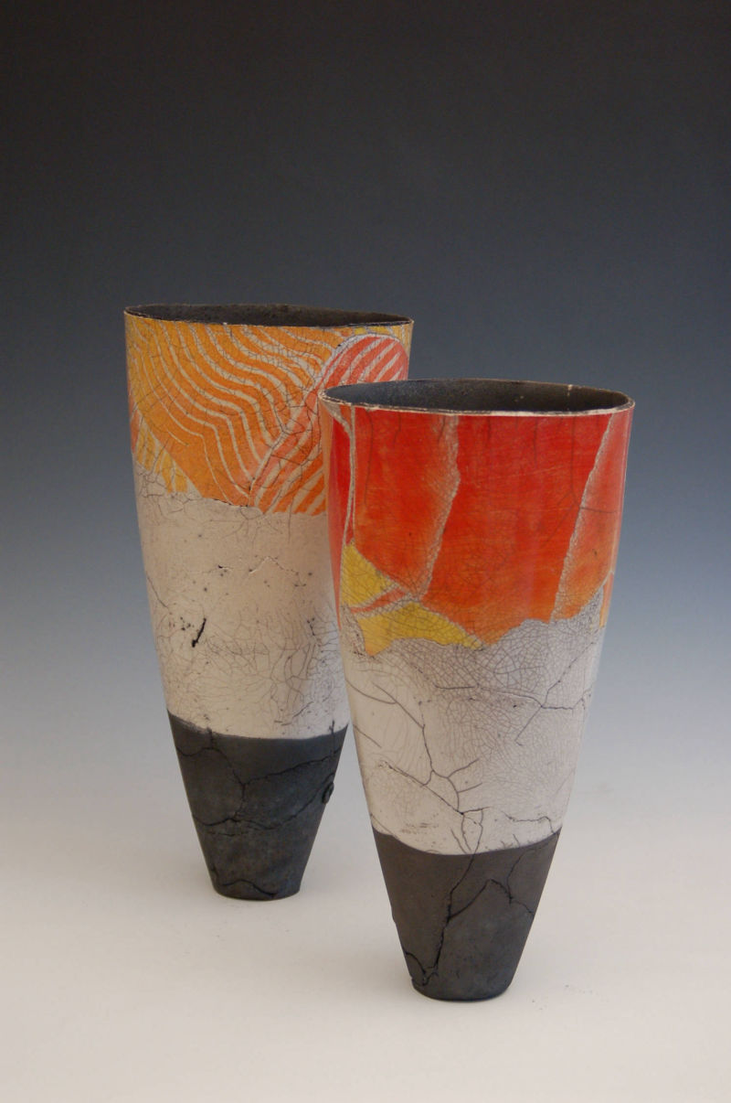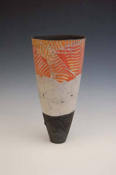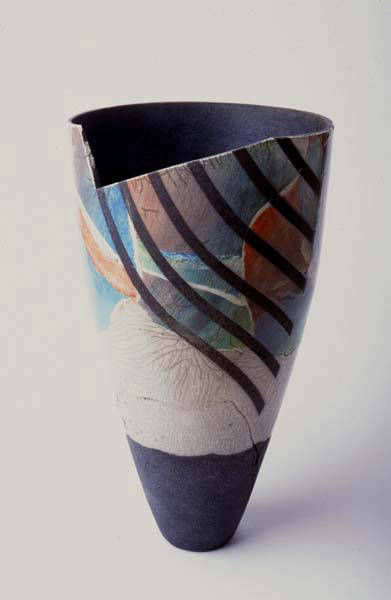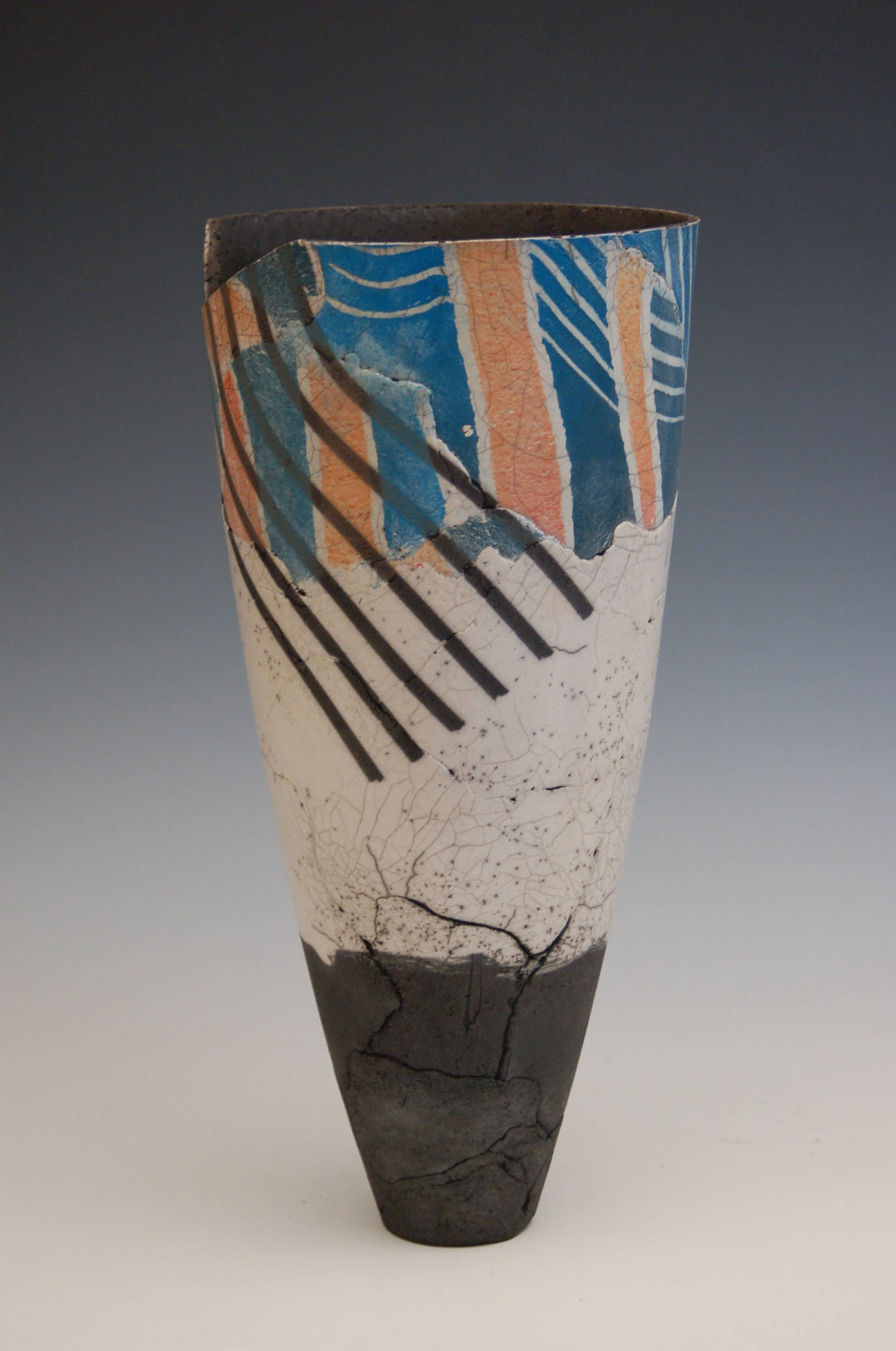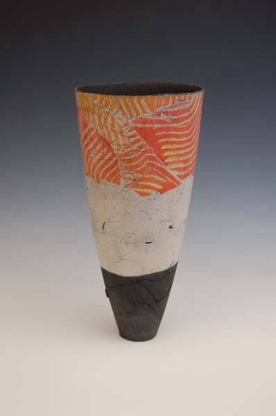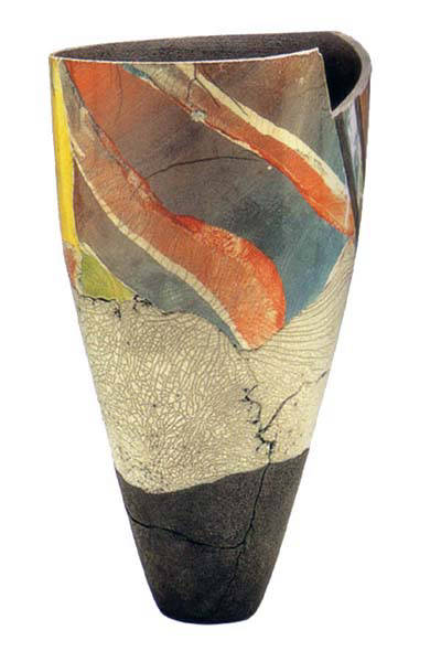 For many years most of my work was primarily vessel based and mainly handbuilt or press moulded, using coloured and laminated clays and Raku fired. The graphic qualities of the decoration and the contrasts in surface finish that raku allows are of paramount importance to me.