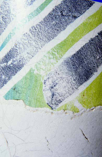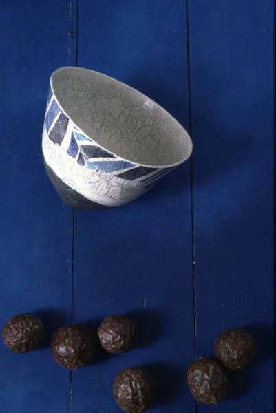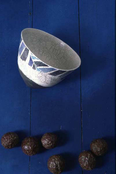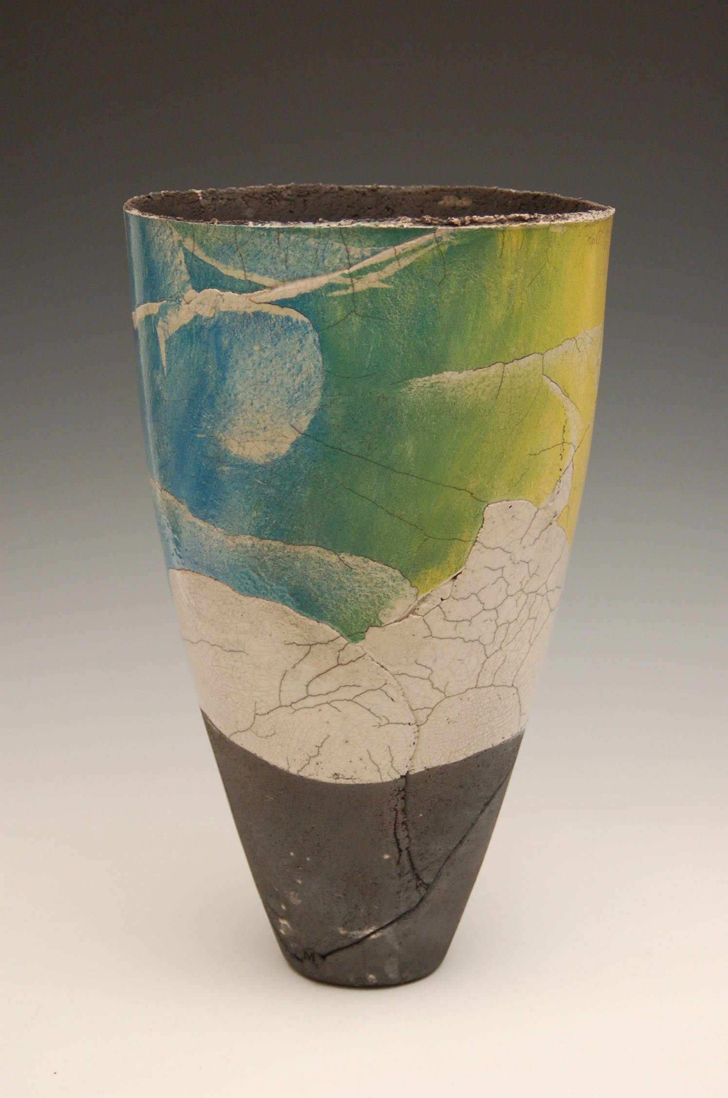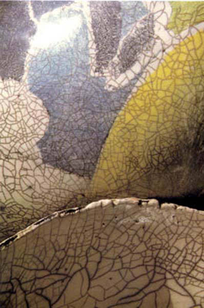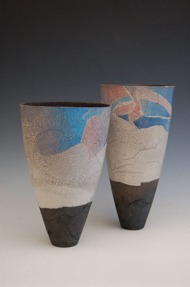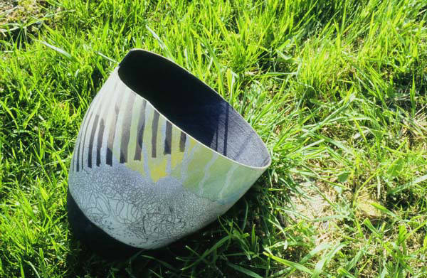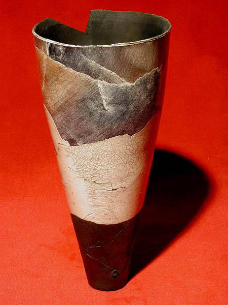 For many years most of my work was primarily vessel based and mainly handbuilt or press moulded, using coloured and laminated clays and Raku fired. The graphic qualities of the decoration and the contrasts in surface finish that raku allows are of paramount importance to me.