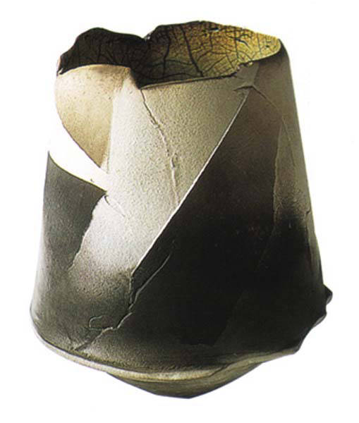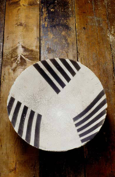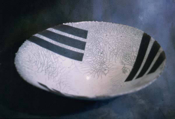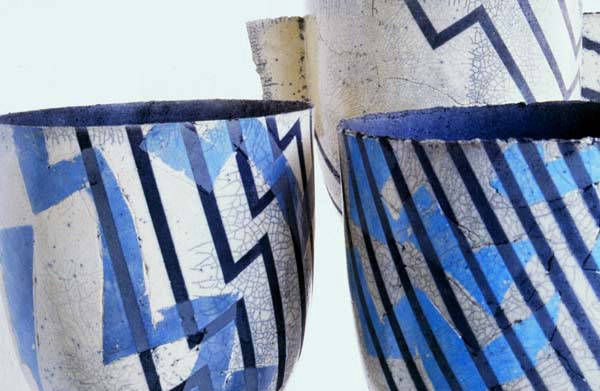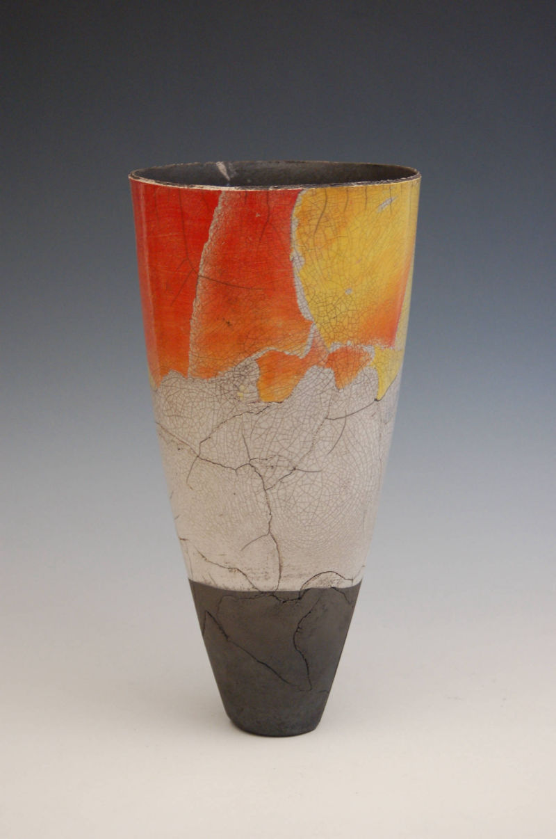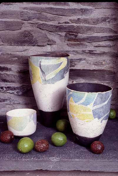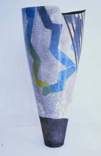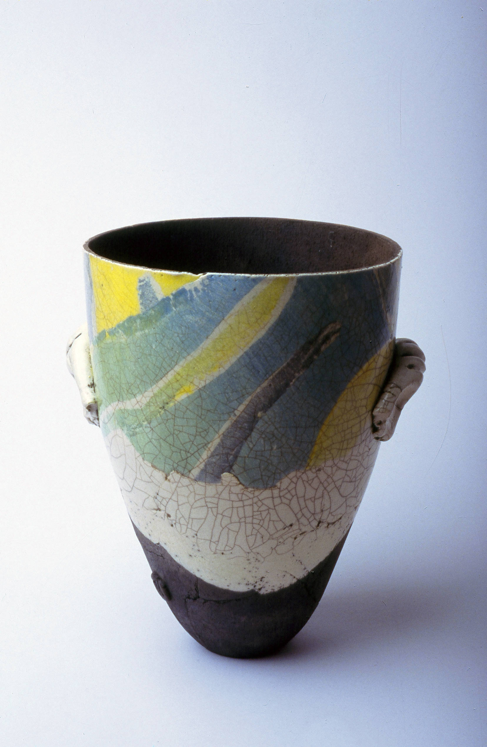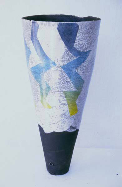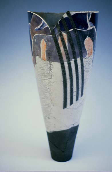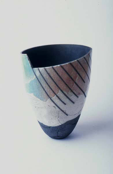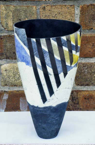 My involvement with raku came from a desire to use a firing process which required a far more direct and personal input. The work consists mainly of press moulded and handbuilt vessel forms, which I develop in series, allowing me to investigate the limitations of the applied surface decoration, whether this be contrasts of tone, texture, glazed and unglazed areas or the interplay of simple, almost classical forms with the graphic, highly coloured decoration. All the pots are subjected to a heavy post firing reduction, usually in dry sawdust or straw.