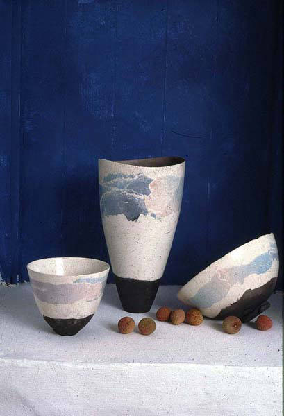 Rich evocations of sun, sea, sand, fields and mountains, cloud and rain create inherent atmosphere in the surfaces of these finely made vessel forms.